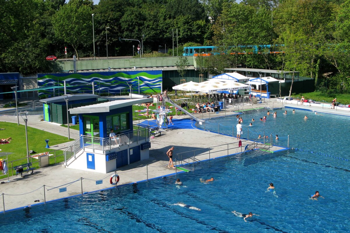 BU: Schwimmen, Spielen und Entspannen im Hausener Freibad (© BäderBetriebe Frankfurt GmbH)