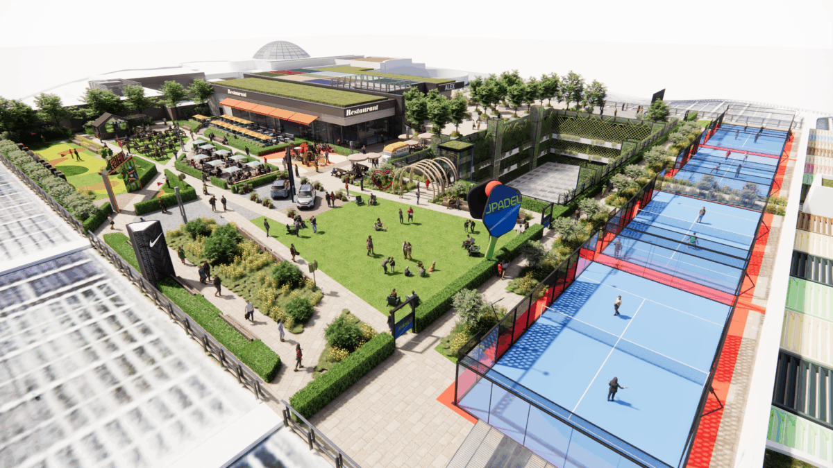 BU: Visualisierung des Skyline Garden mit vier Padel Tennis Courts. Grafik: Skyline Plaza