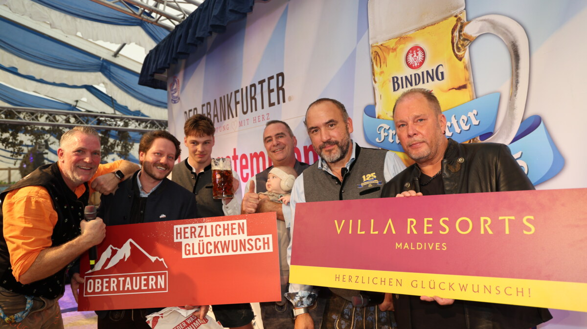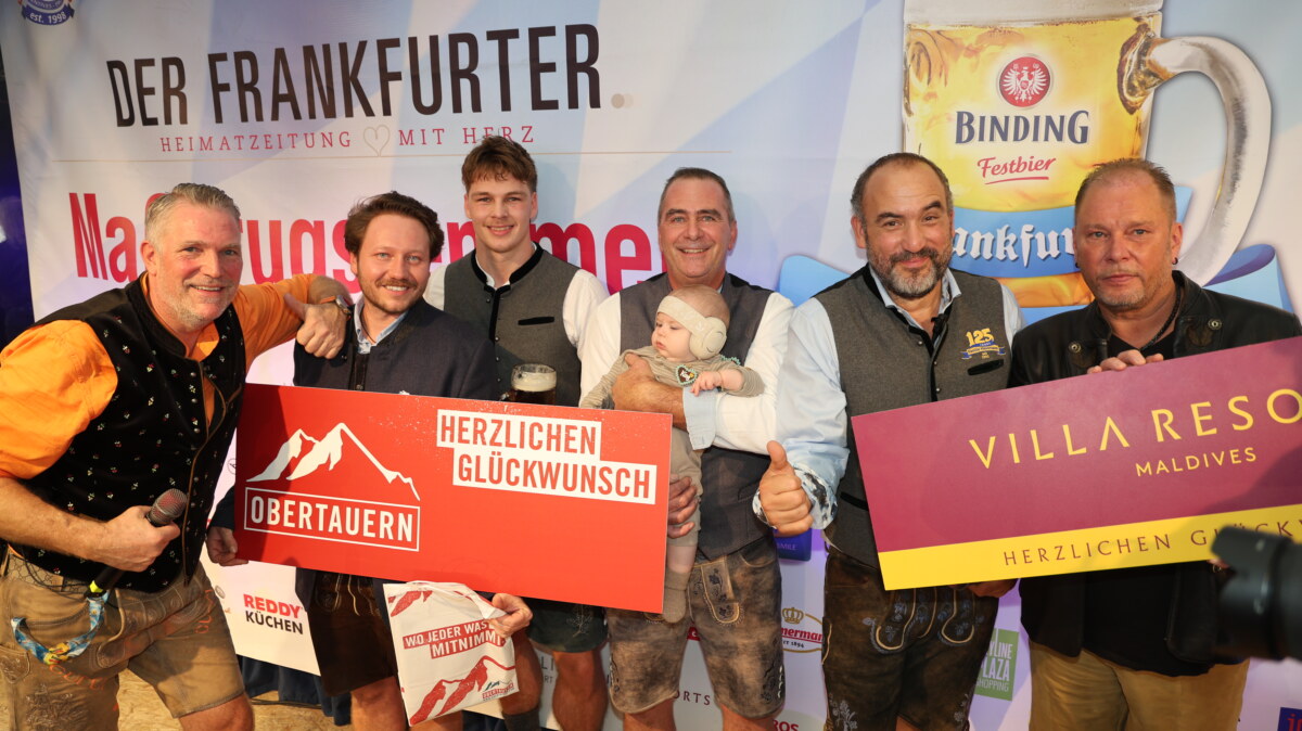 Titelbildunterschrift v.l.n.r. , Kai Mann Festwirtpartner, Florian Rauter Obertauern Tourismusverband Denis Hausmann – Frankfurter Oktoberfest Wirt, Gewinnerin Finale Maßkrugstemmen Alexandra Jafari aus Frankfurt Gewinner Finale Maßkrugstemmen Sascha Grabener aus Kelkheim Jürgen Becker Villa Ressorts (Malediven)