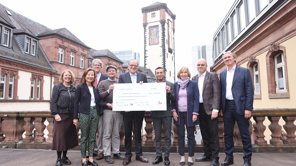 Bereits mehr als 1,7 Millionen Euro hat der Neue Brückenbauverein Frankfurt am Main zum jetzigen Zeitpunkt unter seinem Vorsitzenden Christoph Mäckler für die Turmspitze des Rathausturmes „Langer Franz“ gesammelt. Dieses Geld soll dazu eingesetzt werden, den Rathausturm an der Ecke Bethmannstraße/Buchgasse so zu rekonstruieren, dass er wieder so aussieht, wie vor den Luftangriffen im Jahr 1944. Nun hat der Verein einen ersten Förderbetrag in Höhe von 1,2 Millionen Euro mit einem symbolischen Spendenscheck an die Stadt Frankfurt übergeben.