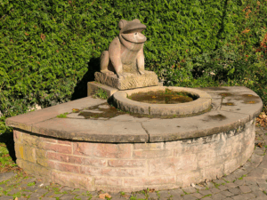 Der Froschbrunnen im Welschgraben ist klein, aber in Zeilsheim gut bekannt. Seit 1992 steht der Brunnen aus rotem Sandstein als Trinkbrunnen im Viertel. Der Brunnen mit dem großen Steinfrosch ist ein Wahrzeichen der Region, und die Liebe zu Fröschen kommt nicht von ungefähr. Der Name „Froschbrunnen“ geht auf den ehemaligen Löschteich zurück, der an den Geräteraum der Freiwilligen Feuerwehr angrenzte. Besonders kleine Amphibien fühlten sich in diesem Löschteich wohl und trieben die Anwohnerinnen und Anwohner, durch nächtelanges quakten, regelmäßig in den Wahnsinn. Da das Froschkonzert nicht enden wollte, musste der Teich allerdings verschwinden.