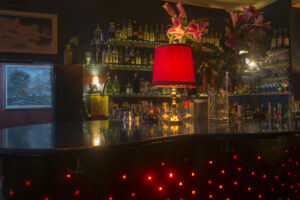 BU: Gedämpftes Licht und Samt – so zeigt sich die elegante Rote Bar am Mainkai. (© Simone Kernchen 2013 – 2025 – https://www.simonekernchen.com/die-rote-bar/)
