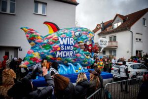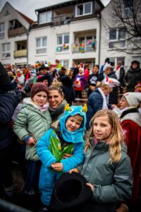 Den Auftakt machte traditionell die „Gemaa-Bumb“, das historische Wahrzeichen des Umzugs. Für Aufsehen sorgten fantasievolle Kostüme – von Hummern mit sechs Beinen bis zum selbstgenähten Krawatten-Cape. Kamelle, Ohrwurm-Hits und politisch-satirische Motivwagen sorgten trotz Nieselregen für ausgelassene Stimmung.