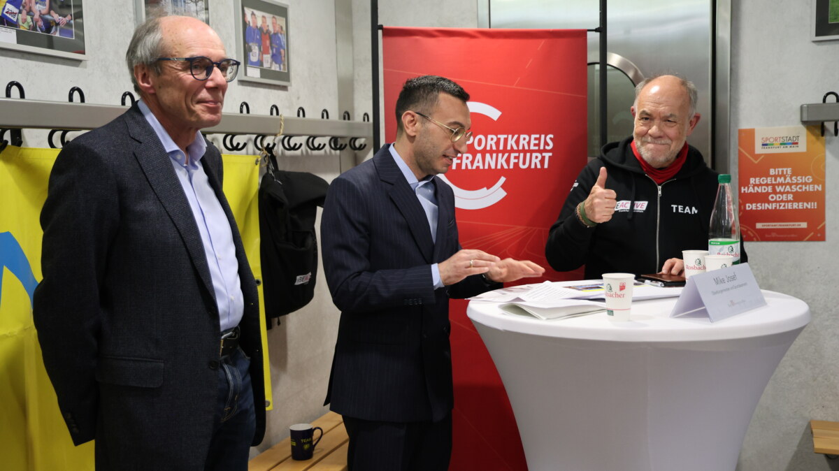 „Das ist meine erste Pressekonferenz in einer Umkleidekabine“, sagt Oberbürgermeister Mike Josef in Funktion des Sportdezernenten. Gemeinsam mit Sportkreis-Vorsitzendem Roland Frischkorn und Spiridon-Chef Michael Spreng stellt er die aktuelle Bilanz des Frankfurter Sports vor.
