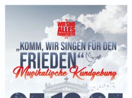 Musikalische Kundgebung am 5. Dezember auf dem Opernplatz Unter dem Motto „Komm, wir singen für den Frieden“ lädt der Verein WIR SIND ALLES FRANKFURTER e.V....